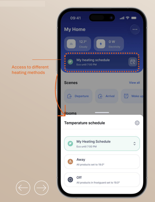 To modify the heating mode to Away or Frost guard from Home+Control app, follow these instructions :