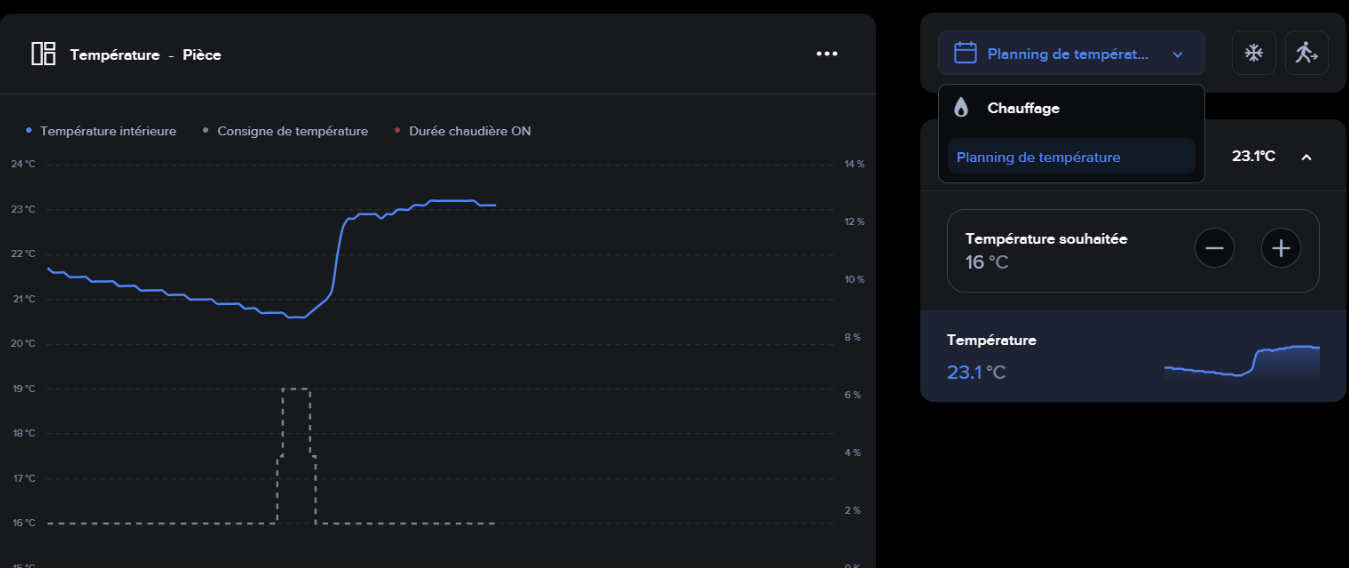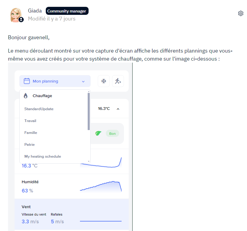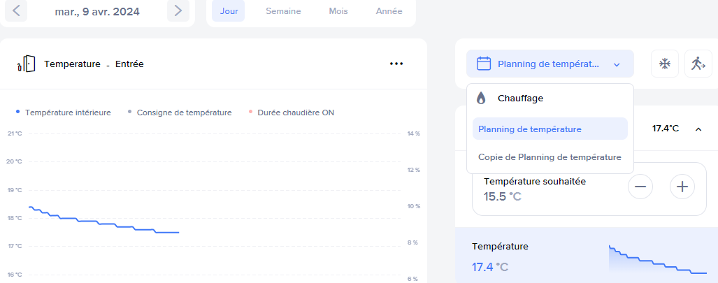 Le menu déroulant montré sur votre capture d'écran affiche les différents plannings que vous-même vous avez créés pour votre système de chauffage, comme dans l'image ci-dessous :