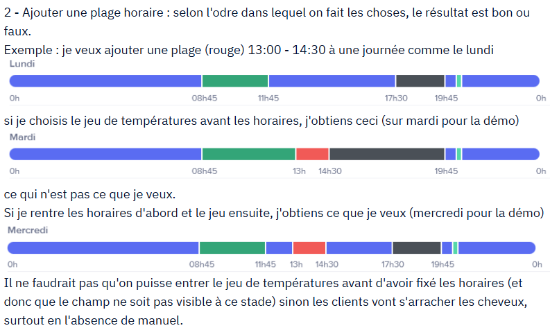 Il ne faudrait pas qu'on puisse entrer le jeu de températures avant d'avoir fixé les horaires (et donc que le champ ne soit pas visible à ce stade) sinon les clients vont s'arracher les cheveux, surtout en l'absence de manuel.