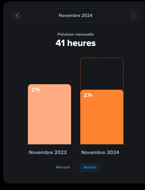 J'ai un autre petit souci avec l'affichage. Quand je vais voir mon bilan sur le mois de novembre, j'en suis à 27 heures, tout comme en novembre 2023. Pourtant, la barre de 2024 est plus basse que celle de novembre 2023. Ce n'est pas très logique.