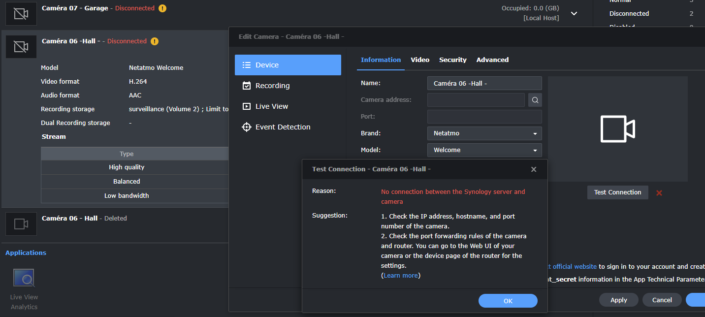 Connection from the Synology Server to the Camera Netatmo Presence can not be established