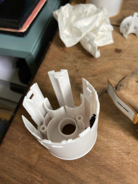 Tu peux aussi bricoler une réparation avec 4 vis, bien disposées - p. ex. 4 vis, disposées en carré pour maintenir la bague. Il faut utiliser des vis à tête plate et préforer les trous, à l'aide d'une mèche à bois de petit diamètre (inférieur au diamètre des vis). Mais cela reste un méchant bricolage, indigne d'un produit de ce type.