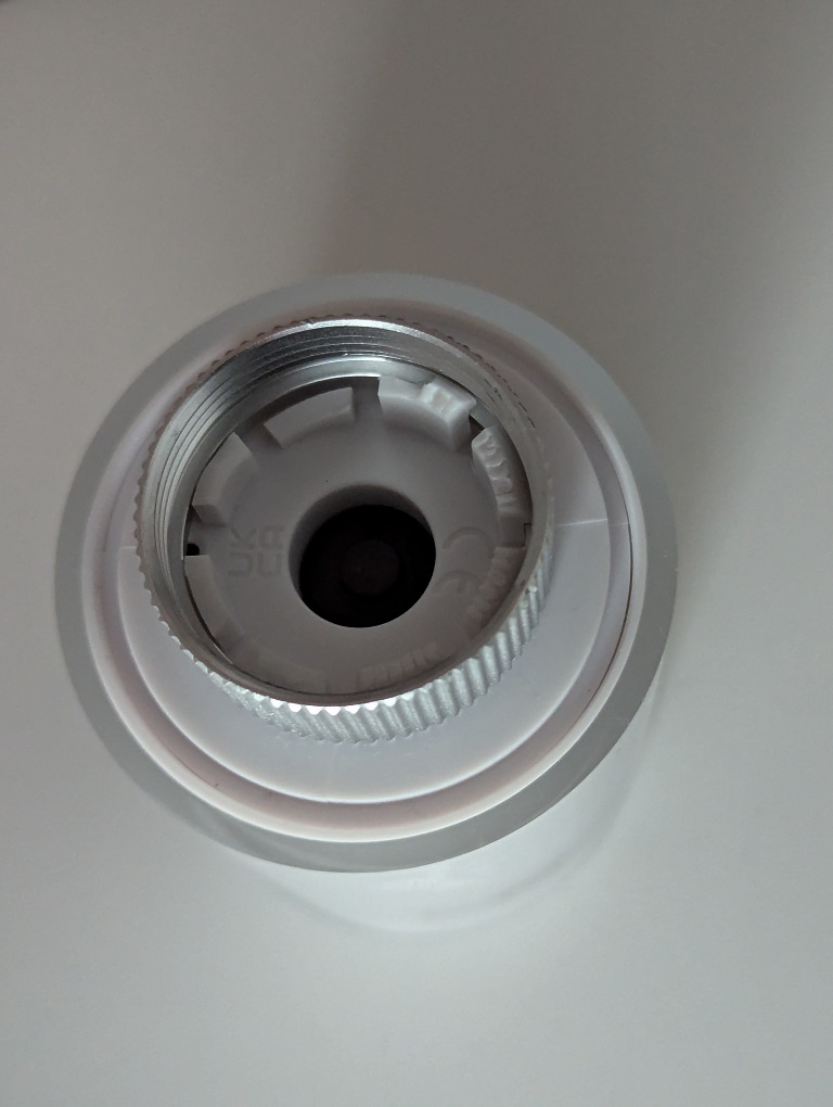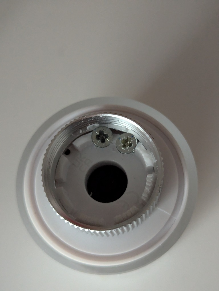 Et une vue de la réparation temporaire. Je n'ai finalement pas employé ces vis, dont la tête biseautée glissait sur la bague. J'ai utilisé des vis à tête plate qui fonctionnent mieux. Il faut forer dans le socle avec une petite mèche à bois pour pouvoir enfoncer les vis.