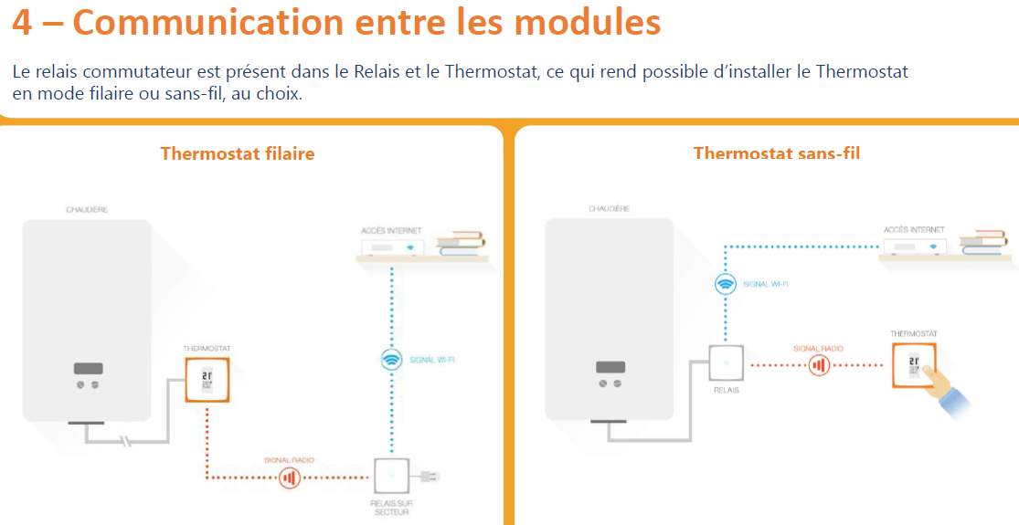 Note : pour la 1ère solution, il faut regarder quel mode d'installation physique est le moins défavorable pour la disposition de votre logement : on peut connecter la chaudière soit au relais, soit au thermostat, voir ci dessous