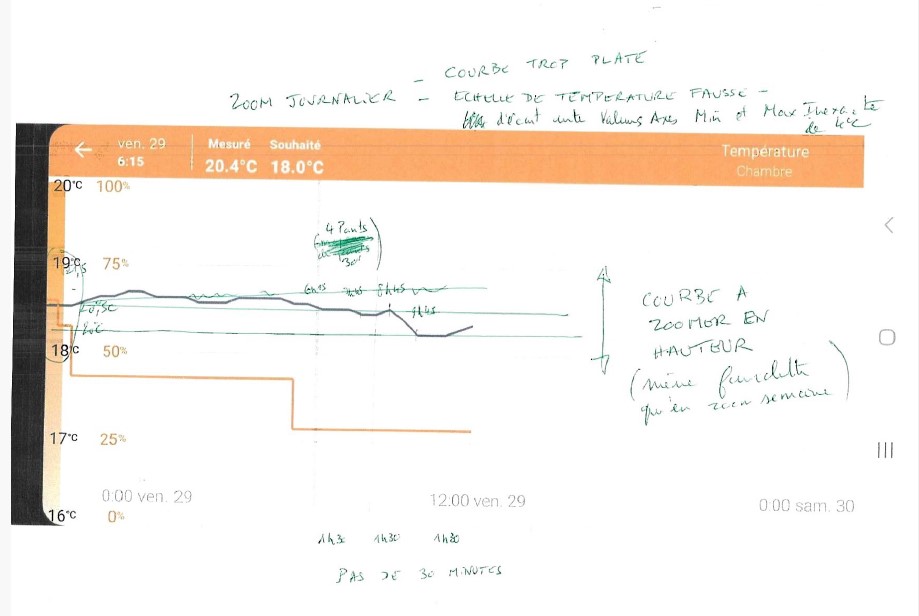 Bonsoir, il y a quand même un manque de fiabilité sur la restitution des températures sur les courbes. Je constate que, pour une température affichée sur le thermostat et en haut de l'écran (horizontal) celle sur la courbe est inférieure de 1°.
