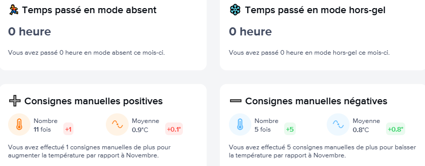 Enfin pour l'utilisation des consignes manuelles, j'ai utilisé hier le Manual Boost (+ 0,5°C) sur deux de mes têtes; le retrouve bien ces 2 utilisations en positif, mais avec une moyenne de 1°C !