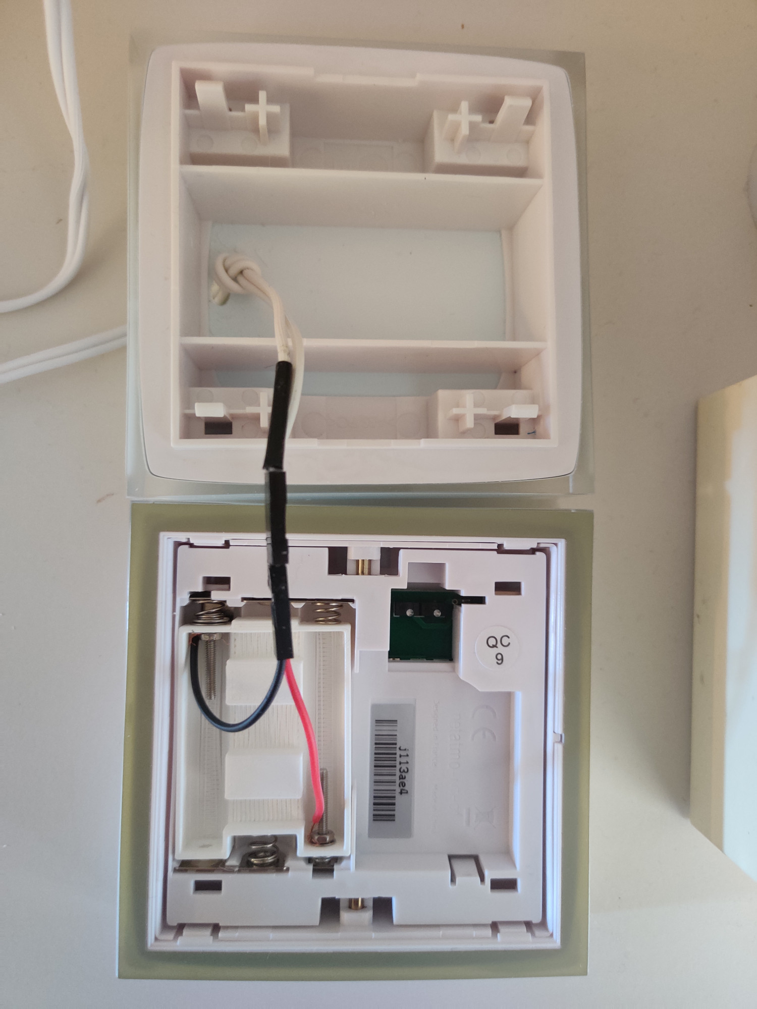 I used one that could provide a 4.5V output and connected it to the battery slots, using a piece made with my 3D printer to avoid soldering directly to the Netatmo device.