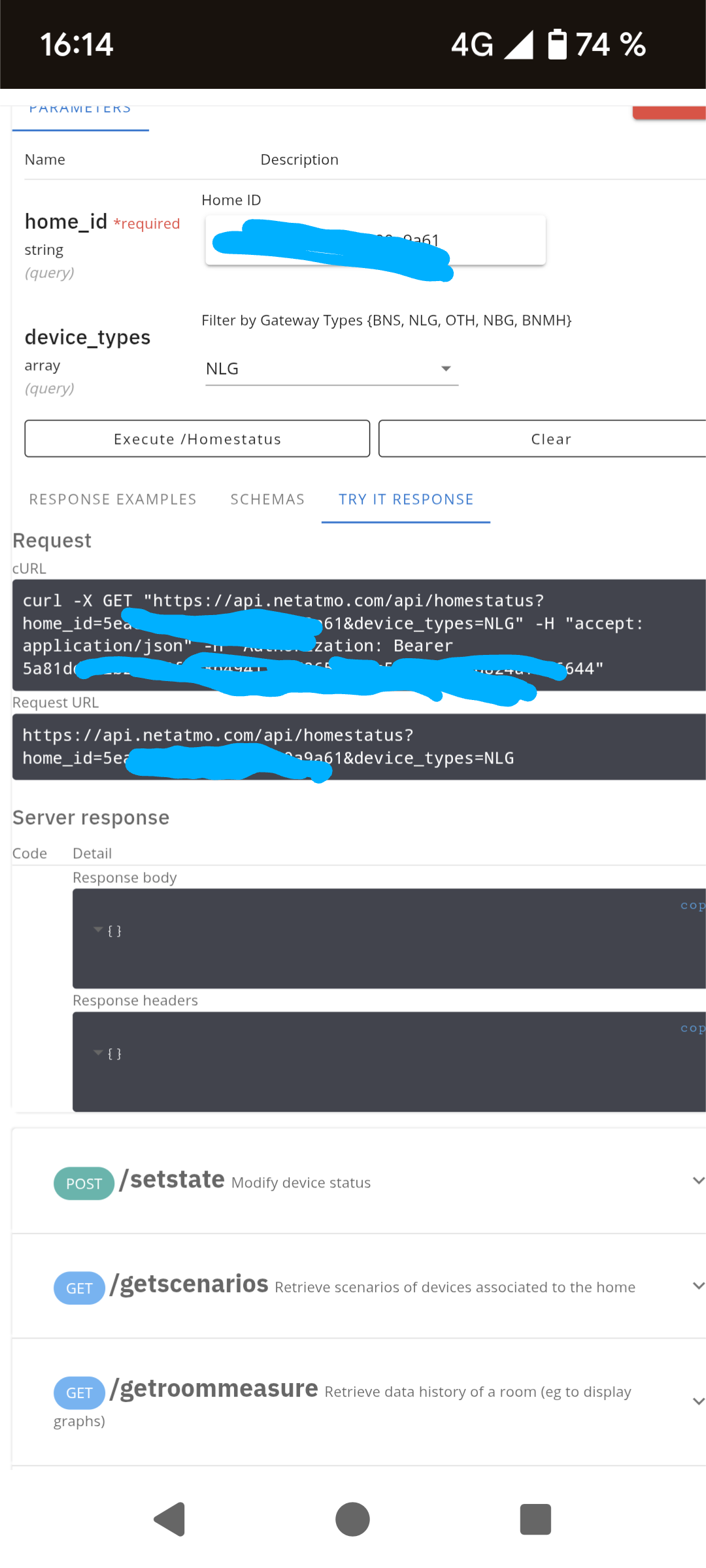 I generated a new client application, no changes, homestatus returns an empty json while refresh token is generated correctly. Only homedatas works