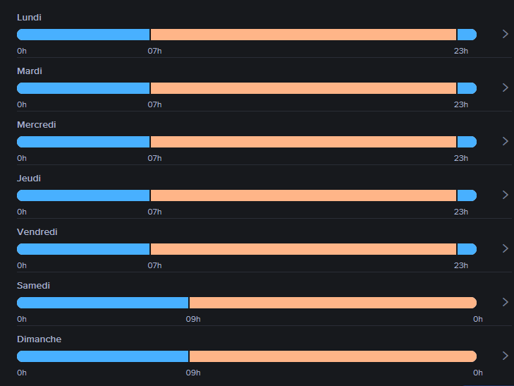 Mon appartement est chauffé par une chaudière à gaz. Je dispose d'un thermostat intelligent et de 4 tête thermostatique connectées. Dans mon planning, en semaine, toutes les pièces équipées de mon appartement doivent passer en température "nuit" (17°C) de 23h00 à 7h00, puis repasser en température "confort" (19°C) de 7h à 23h00.