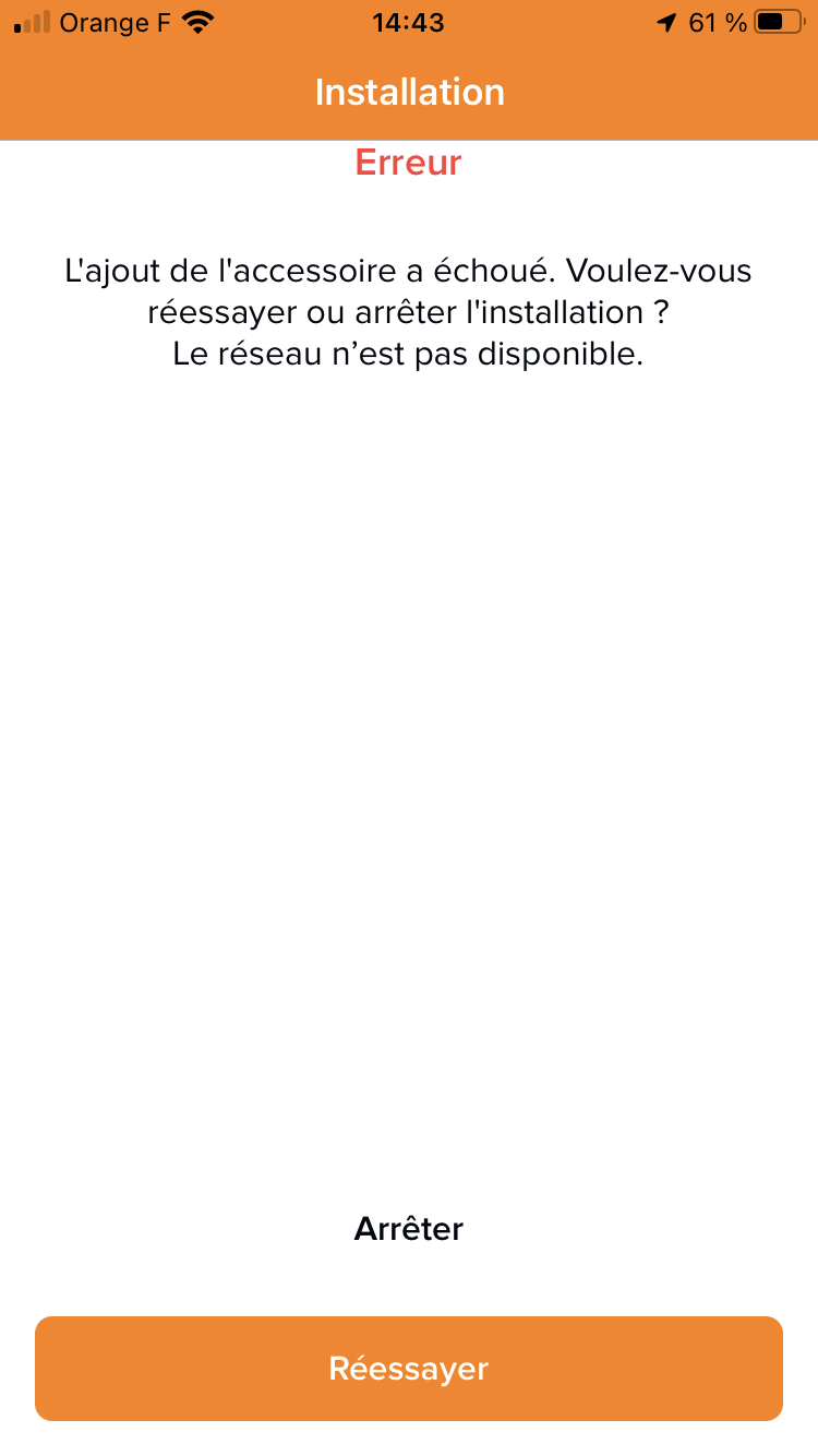 Le message d’erreur affiché est : « L'ajout de l'accessoire a échoué. Voulez-vous réessayer ou arrêter l'installation ? Le réseau n'est pas disponible. »