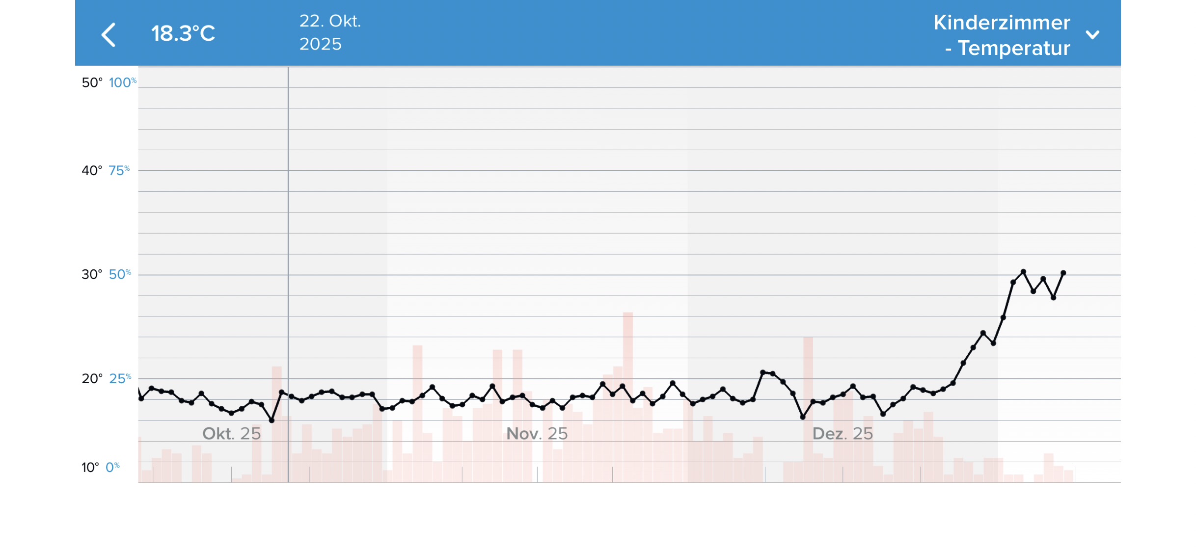 The Issue: One specific valve consistently reports a false "Current Temperature" increase. Even after a successful calibration, the temperature reading starts climbing slowly. Within 24 hours, it hits 30°C (86°F), even though the radiator is physically cold and the actual room temperature is much lower.