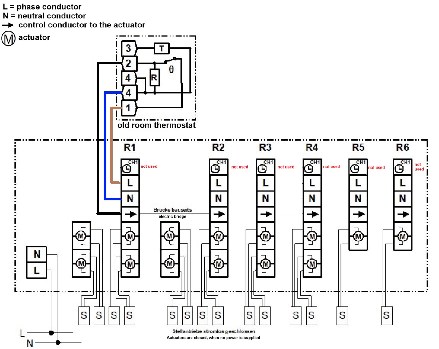 R1 (black -> Pin 2 on the old room thermostat)