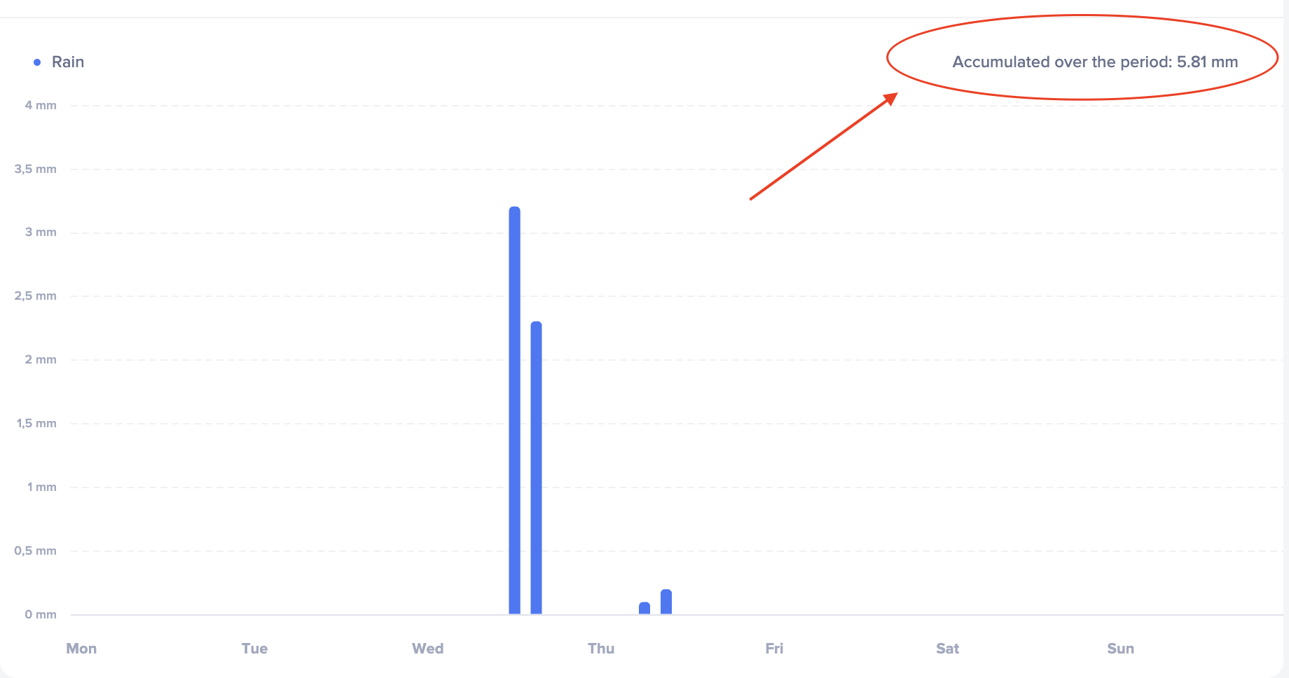 - Le cumul de la pluie ou la vitesse maximale du vent sur la période que vous avez sélectionné (Jour, Semaine, Mois, Année) est affichée dans le coin supérieur droit du graphique.