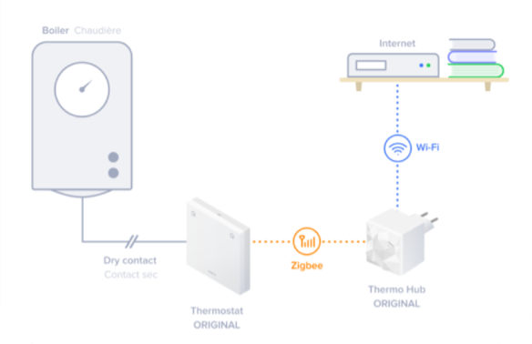 Il se connecte à chaque module (Thermostat Original, Thermo Link) de votre maison et gère la régulation de la température. Le Thermo Hub se connecte à Internet, permettant le contrôle à distance via l'application.
