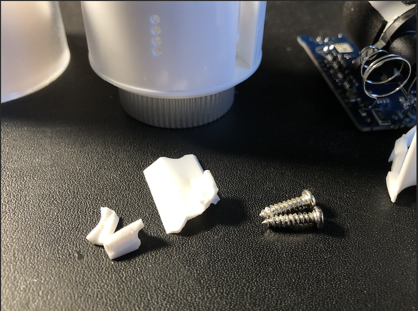 Further dismantling shows that the problem is not confined to the retaining lugs. Parts of the battery tube and one of the posts retaining the motor mounting screw has also broken away. These are all areas where the plastic is under most stress when the valve is closing or shut and it is likely to happen more frequently as the population of Netatmo valves ages.