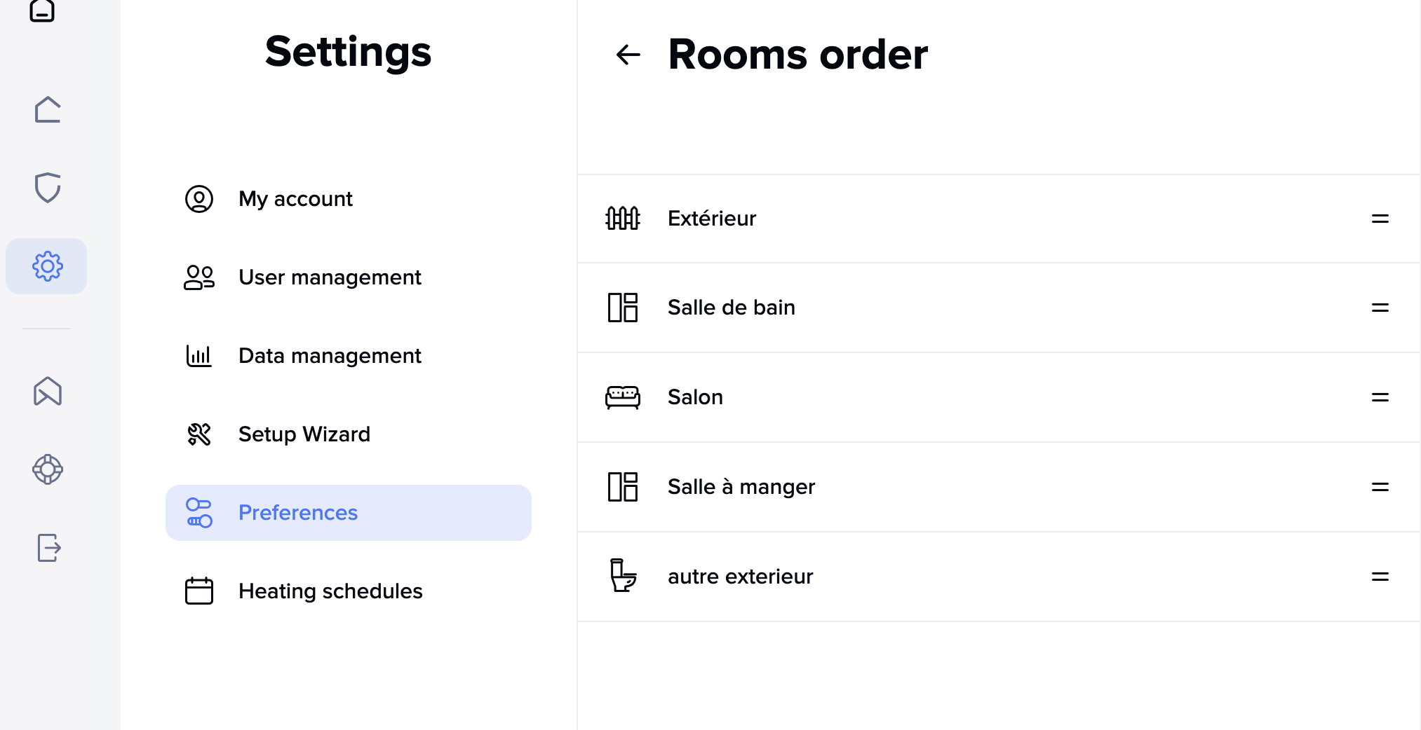 - Je kunt de volgorde van je ruimtes wijzigen door ze in de gewenste volgorde te slepen.